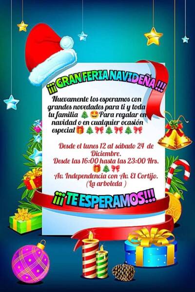 Gran variedad de productos para que tu regalo sea el más especial en esta navidad. La feria cuenta con más de 30 puestos de bazar, juguetería, artesanías, ropa, productos de belleza, entre muchas otros servicios y productos. Está ubicada en la calle Alberto González, entre Olivo y Ximena estará atendiendo entre las 17:00 y las 23:00 Hrs. hasta el mismísimo sábado 24 de diciembre.